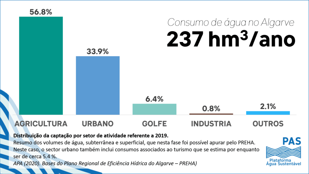 Segundo um estudo da Gulbenkian a agricultura é o maior consumidor de água no país e no Algarve, segundo dados do PREHA, o setor da agricultura gasta anualmente ca. 135 milhões de metros cúbicos, representando 57% do volume total de água contabilizada no Algarve (o setor urbano consome 34% e o setor do golfe 6%; perguntamos – quantas centrais de dessalinização terão que ser construídas para abastecer a agricultura?